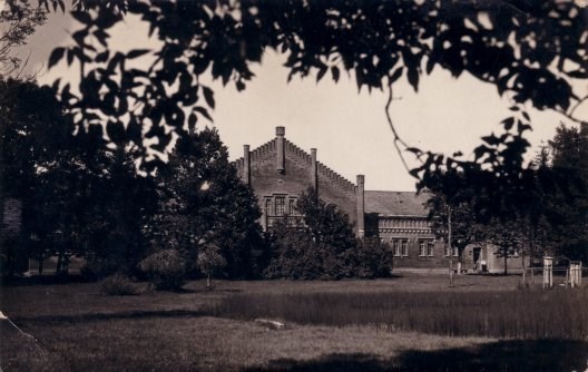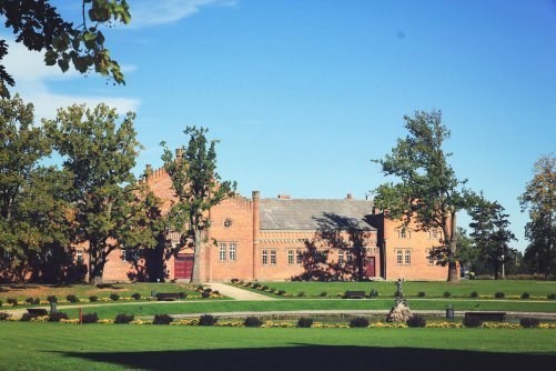 The red brick building, which is in front of the manor belonged to duke M. Oginskis and it was used as the stud. It was built in 1897.