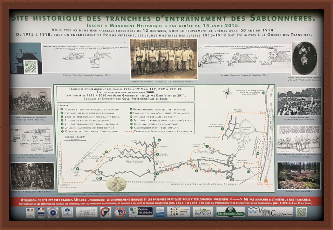 Le site forestier des Sablonnières a accueilli les tranchées d’entraînement du 113e régiment de Blois, en 1915 ; les soldats y apprenaient à construire et vivre dans les tranchées avant de partir au front.