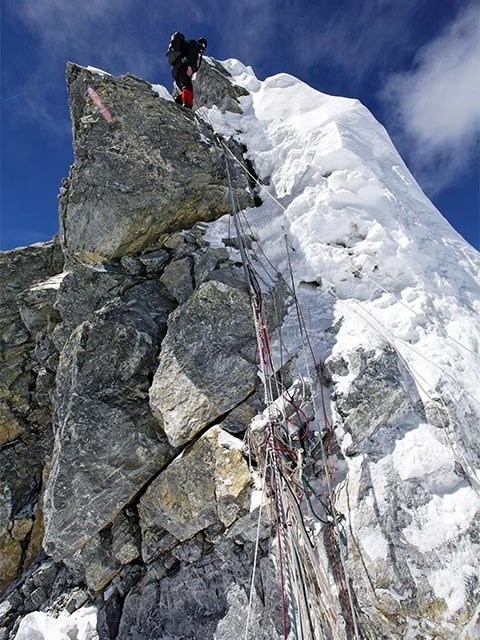Here is a formidable challenge, only a few brave men (and women) have made it past here. Only one person at a time is allowed on the step. This near vertical rock face with a height of 12” is the last real challenge. Fixed ropes are placed to assist the climbers.