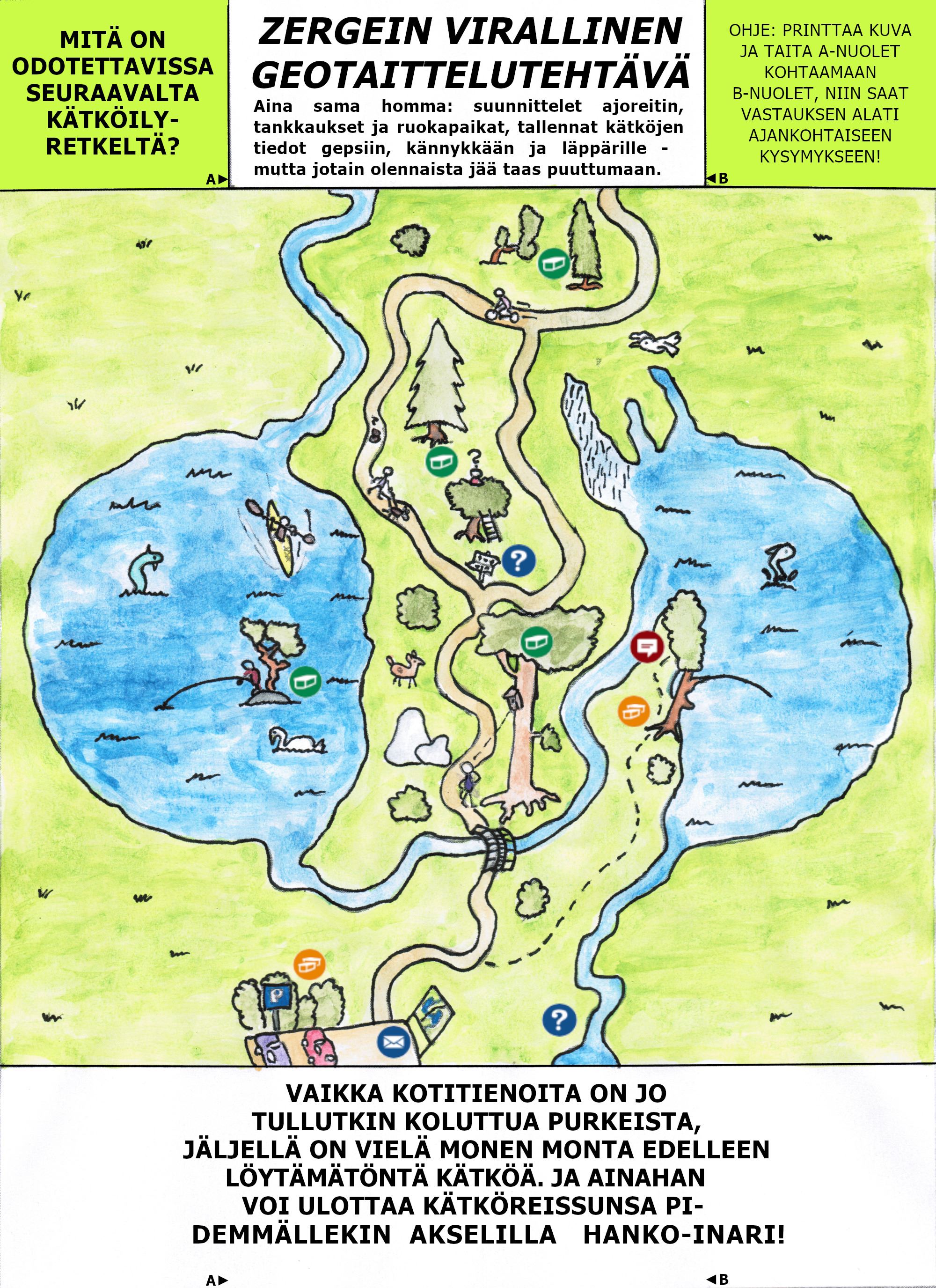 [EN] An easy mystery in the spirit of legendary Mad magazine. Solving this fold-in puzzle shouldn't be too hard even if you don't understand a word of Finnish, just print out the image and fold the 'A' arrows to meet the 'B' arrows and you'll get the answer sentence. Write the answer into the checker (leave out dashes) and you will get the coordinates.