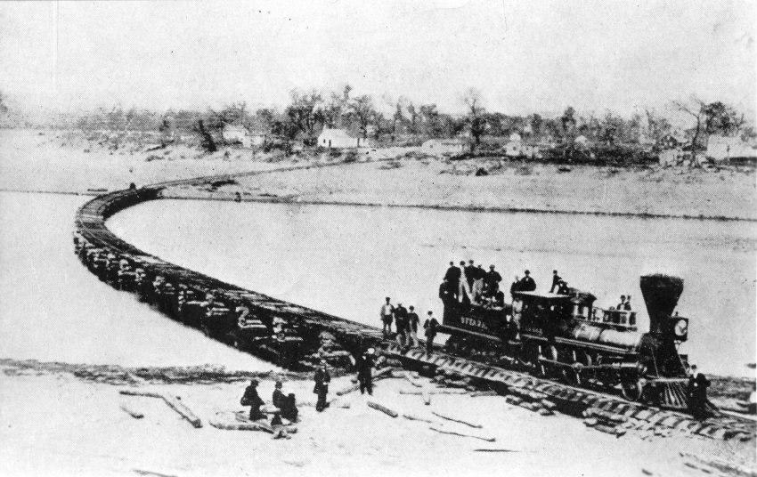 The Leavenworth, Lawrence, and Galveston train crosses a floating bridge.