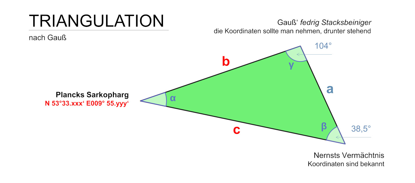 [Gauß] Sie triangulieren, wie ich einst das Königreich Hannover. Sie kennen den fedrig Stacksbeinigen und Nernsts Vermächtnis. Zwei Winkel hab‘ ich hier: 104° vom gefiederten Freund, 38,5° vom Vermächtnis.
