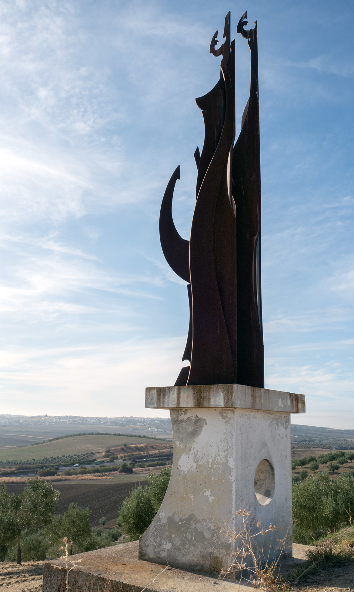 The sculpture Al paisanaje represents a man and a woman, is about 10 meters high and is located about 300 meters from the highway. The sculptor has played perfectly with the light, so that the man looks east and receives the first rays of the sun of the day and the woman, who has a large belly, looks towards Fernán Núñez, with a sense therefore more maternalistic.