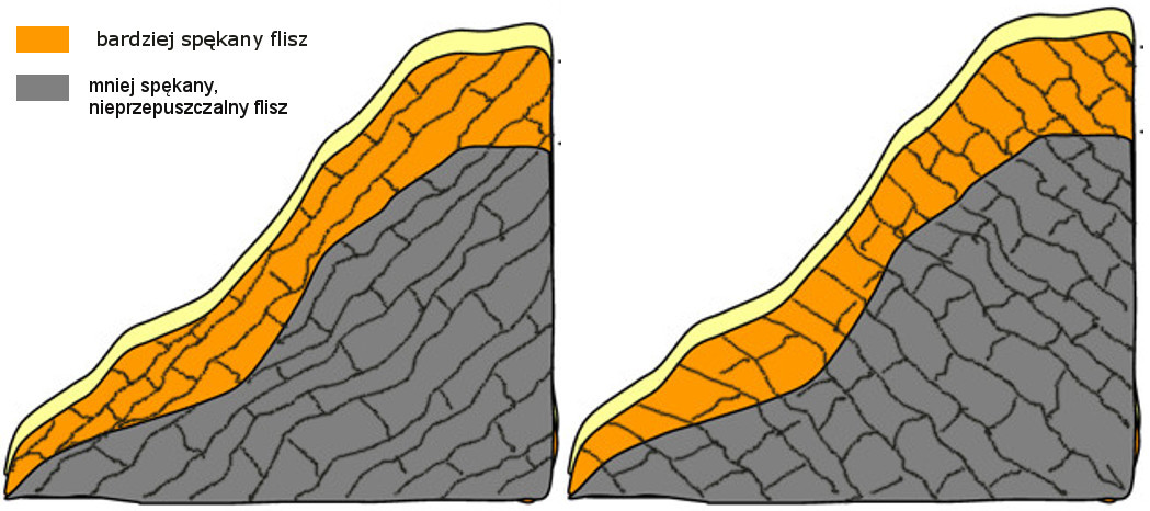 Jak widać kluczowe w tym przypadku procesy zachodzą na granicy pomiędzy warstwą silnie spękaną i niespękaną. W przypadku fliszu granica ta często jest umowna, choć wierzchnia warstwa skały (ze względu na mniejszy ciężar dociskających skał oraz wskutek różnego rodzaju wietrzenia) jest zazwyczaj bardziej rozluźniona i bardziej podatna na infiltrację wody. Powierzchnia po której spływa woda (która w przypadku powstania osuwiska staje się często jego powierzchnią poślizgu) może być zarówno konsekwentna jak i insekwentna (Rys 12). W przypadku powierzchni konsekwentnych woda, które je tworzy przepływa wzdłuż słabszej warstwy skalnej (np. łupka ilastego lub ilu), w której często występują nieciągłości i szczeliny (np. płaszczyzny łupliwości łupka). W przypadku powierzchni insekwentnych woda do przepływu dodatkowo wykorzystuje poprzeczne do kierunku uwarstwienia fliszu spękania w warstwach piaskowca. Cały mechanizm jest zazwyczaj bardziej złożony; w obu przypadkach woda przepływa zarówno przez nieciągłości w warstwach słabszych jak i spękania warstw mocniejszych, a przepływ nie odbywa się na jednej lecz na kilku powierzchniach: ostatecznie zniszczenie występuje na tej powierzchni, gdzie materiał jest najbardziej rozluźniony, o najbardziej obniżonych parametrach (a czasami na kilku takich powierzchniach jednocześnie).