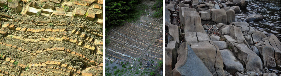 Rys 1. Różne układy fliszu. Poszczególne zdjęcia przedstawiają: po lewej - pofalowane warstwy piaskowca i łupka o różnej grubości i niemal poziomym układzie (źródło: M. Cała, A. Tajduś, prezentacja "Budowa tuneli w warunkach fliszu karpackiego", na stronie Kongersu Drogowego), na środku - wyraźnie pod kątem ułożone warstwy fliszu (źródło: T.Smolik zdjęcie na stronie Słownik geologiczny), po prawej - niemal pionowo ułożone warstwy piaskowca z niewielkimi przewarstwieniami (źródło: B. Ciach, zdjęcie na stronie bywajtu.pl)