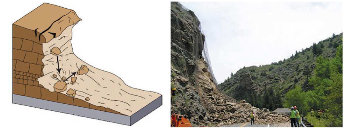 Rys. 5. Obwał (źródło rysunku: strona Brytyjskiej Służby Geologicznej (BGS); źródło zdjęcia: A. Borecka - prezentacja "Geodynamika", na stronie Akademii Górniczo-Hutniczej (AGH) w Krakowie)