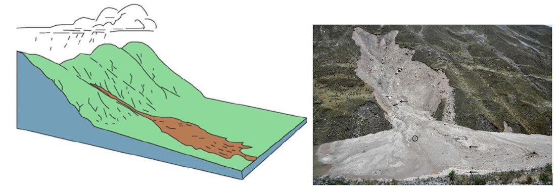 Rys 9. Spływ gruzowy (źródło rysunku: Highland, L., & Bobrowsky, P.. TXT-tool 0.001-2.1 Landslide types: descriptions, illustrations and photos. In Landslide Dynamics: ISDR-ICL Landslide Interactive Teaching Tools (pp. 1-38). Springer, Cham, 2018; zmodyfikowane zdjęcie Z. Engel ze źródła: Engel, Z., Česák, J., & Escobar, V. R.. Rainfall-related debris flows in Carhuacocha Valley, Cordillera Huayhuash, Peru. Landslides, 8(3), 269-278, 2011)