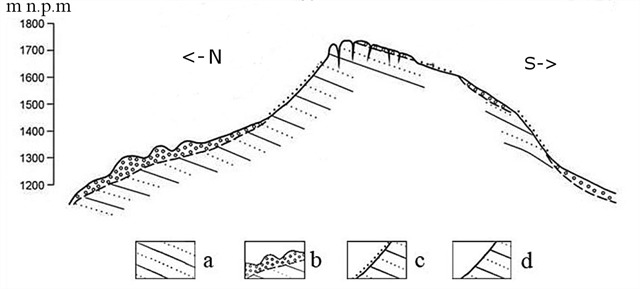 Jeszcze lepiej widać to na przekroju przez szczytowe partie przedstwionym na rysunku poniżej. Pokazano tutaj nie tylko róznice w kształcie poszczególnych zboczy, ale również nachylnie warstw fliszu, a także wyróżniono oryginalny (nieprzemieszczony) materiał skalny oraz koluwium tj. materiał przemieszczony wskutek ruchów masowych – osuwisk.