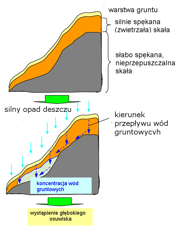 Osuwiska we fliszu karpackim mogą przybierać różne formy, ale prawie zawsze związane są z pojawieniem się silnych opadów deszczu. Typowy mechanizm tworzenia się tzw. głębokich osuwisk, powstający wskutek opadów, przedstawiono na Rys. 12. Woda opadowa przenikając przez silnie spękaną warstwę skały natrafia poniżej na warstwę słabo spękaną i przepływa na poziomie jej powierzchni, tj. na kontakcie dwóch warstw (obniżając parametry wytrzymałości na powierzchni przepływu). Kiedy przepływająca woda natrafia na miejsce, przez które nie może przepłynąć, zaczyna się tam gromadzić, a wytworzone ciśnienie pomaga odspoić warstwy od siebie.