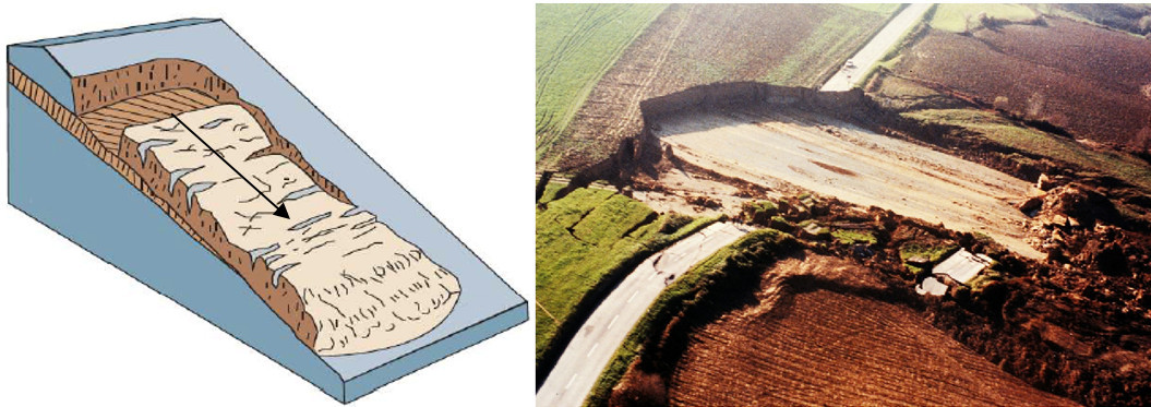 Rys 7. Zsuw translacyjny (zmodyfikowany rysunek ze źródła: L.Highland, M.Johnson - informacja o typach osuwisk na stronie Amerykańskiej Służby Geologicznej (USGS); źródło zdjęcia: C. Scavia w: Hungr, O., Leroueil, S., & Picarelli, L. The Varnes classification of landslide types, an update. Landslides, 11(2), 167-194, 2014)