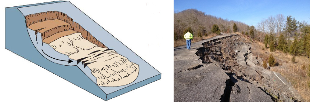 Rys 6. Zsuw rotacyjny (zmodyfikowany rysunek ze źródła: L.Highland, M.Johnson - informacja o typach osuwisk na stronie Amerykańskiej Służby Geologicznej (USGS); źródło zdjęcia: M. Crawford. zdjęcie osuwiska na stronie Służby Geologicznej Stanu Kentucky (KGS))