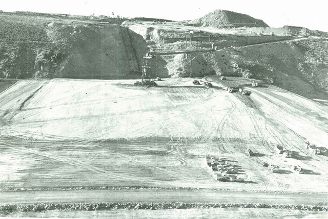 Before building the dams are cleared of all topsoil. This removes all the soft silt, clay, or other material that they cannot control. This was done down to the bedrock. Once the bedrock was exposed they then began to drill for the grout curtain.