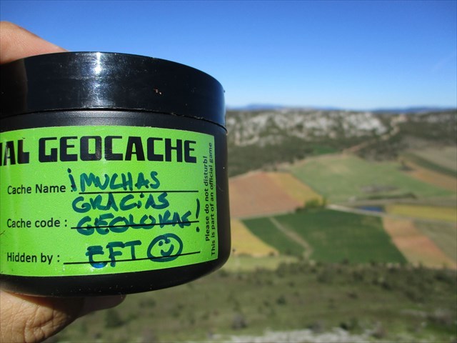 Situado en un bonito mirador de Las Loras, este caché es un homenaje y un agradecimiento al equipo GEOLORAS por el trabajo que han realizado para que pudieramos disfrutar del "Geopasaporte Geocaching del Geoparque Las Loras". Muchas fueron las veces que atravesabamos el Geoparque por la carretera que comunica Aguilar de Campoo con Burgos y muchas fueron las veces que decíamos: "algún día tendremos que parar", al pasar por sitios como la Cueva del Agua de Basconcillos del Tozo o ver carteles que indicaban la dirección hacia pueblos como Sargentes de la Lora o Humada. Y el descubrir esta manera de conocer 50 rincones de los más bellos del Geoparque a través del Geocaching ha sido la excusa perfecta para que llegara ese día de parar en tantos lugares maravillosos donde buscar los tesoros de los Amig@s de GEOLORAS. Así que por ello, ¡muchísimas gracias!, porque nos lo hemos pasado en grande, hemos conocido lugares geniales y volveremos a seguir recorriendo este espectacular territorio muchas veces más a seguir descubriendo más tesoros que seguro que quedan!... ¡Así que, aquí os dejamos estos humildes tesorillos para que quede constancia de nuestro agradecimiento!