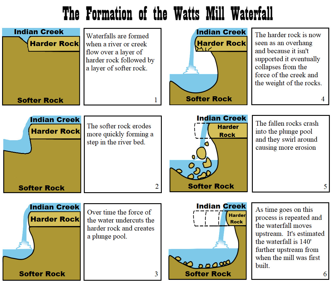 Often, waterfalls form as streams flow from soft rock to hard rock. This happens both laterally (as a stream flows across the earth) and vertically (as the stream drops in a waterfall). In both cases, the soft rock erodes, leaving a hard ledge over which the stream falls.