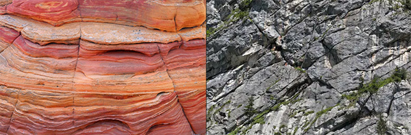 Sandstone is created in layers (left). If you can see horizontal lines through the stone indicating these layers, you will likely find it is sandstone and not limestone. Sometimes the layers may not be horizontal if the rock has been tilted at some point in it's history but the layers should be clear to see. Limestone is made mostly of calcium deposits from large collections of shell, bone and coral and creates a more solid rock. It tends to form in thicker denser beds rather than layers (right). Remember to look at the whole cliff, not just the immediate chapel.