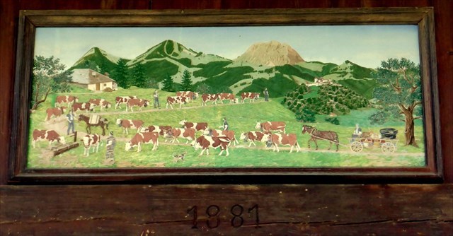 Sur cette POYA l'armailli en tête du troupeau regarde le château de Gruyères sur sa colline au pied du Moléson (la montagne mythique du gruérien, tout comme le Ménez Hom pour le breton). Il est suivi des vaches avec leurs sonnailles ou leurs toupins et des autres armaillis. L'un conduit le mulet (en général prêté par l'armée) bâté qui lui permettra de descendre les fromages, confectionnés à l'alpage, pour les affiner en plaine. Un taureau est aussi de la partie. La POYA se termine par le cheval qui tire le char du " train de chalet" et le chaudron qui servira à la fabrication des meules de gruyères, si réputées qu'elles seront exportées aux halles de Genève, via le port de Vevey, puis en France, au Piémont et même à la Nouvelle-Orléans au XVIIIéme siècle pour nourrir les troupes françaises.