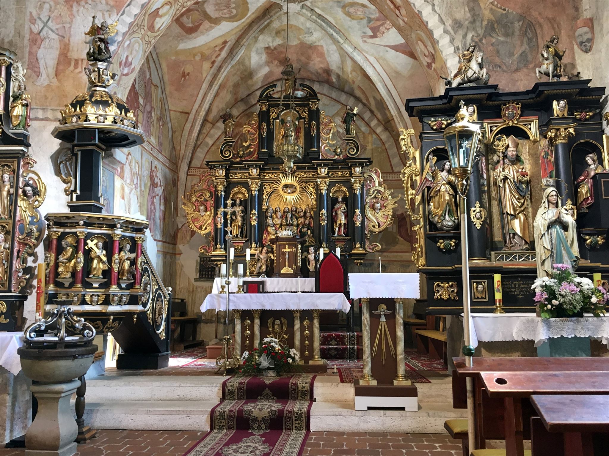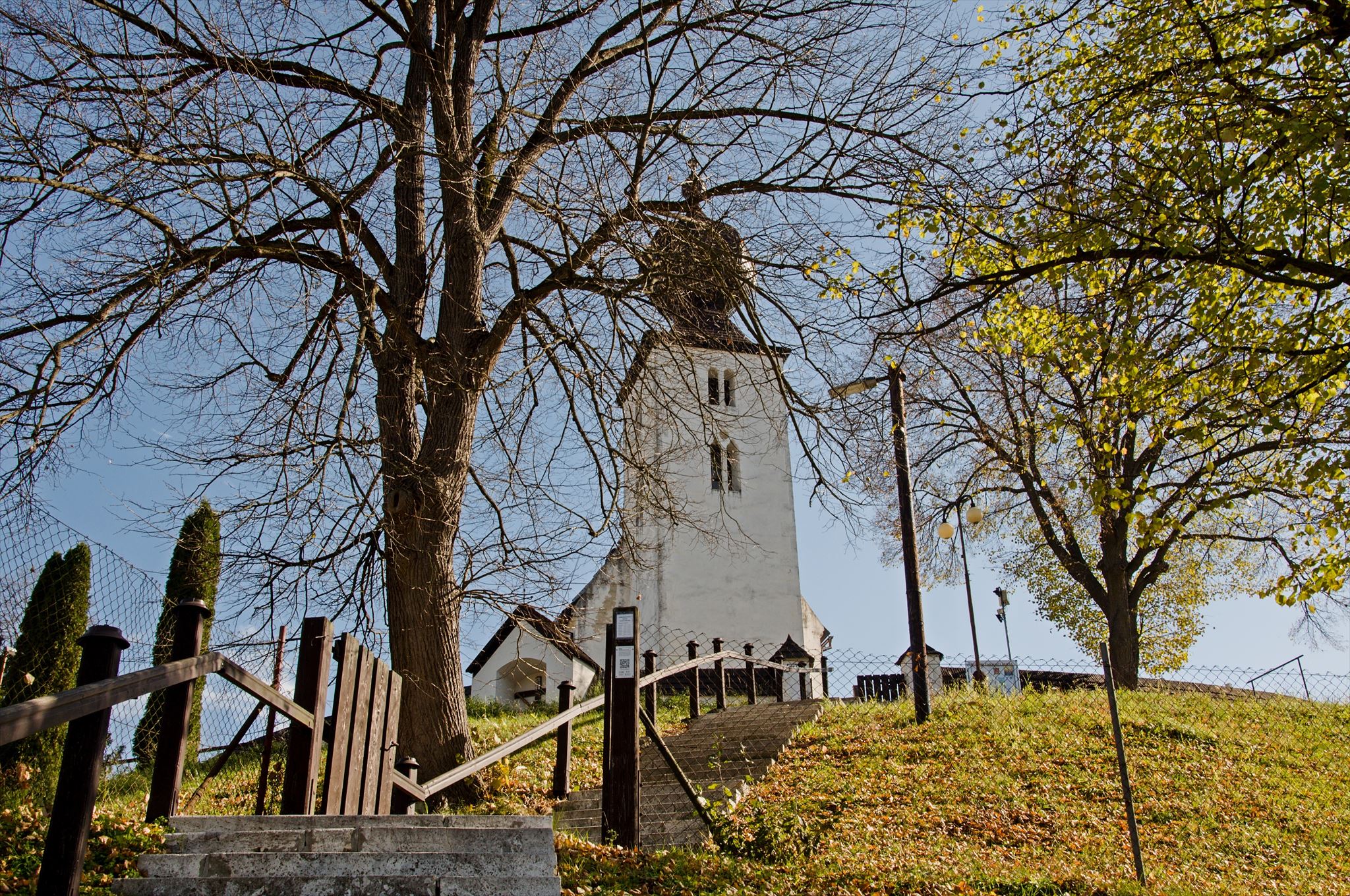 Farský kostol, ktorý v priereze dejín slúžil katolíkom i evanjelikom, je opevnený a vedie k nemu 93 schodov, ako inak, z travertínu.