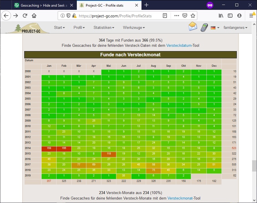 - Es wäre schön, wenn Ihr mit Eurem Online-Log dies auch nachweist, z. B. mit einem Screenshot des Challenge-Checkers oder Eurer Statistik, Bereich "Funde nach Versteckmonat". Ansonsten überprüfe ich das nach Eurem Log eben selbst. Logs von Cachern, welche die oben genannten Vorgaben nicht erfüllen (="roter" Checker), werden gelöscht. Bitte beachtet, dass gemäß den aktuellen Vorgaben für Challenge-Caches Lab Caches, Waymarks und Benchmarks nicht zählen! Das sollte dann so aussehen: