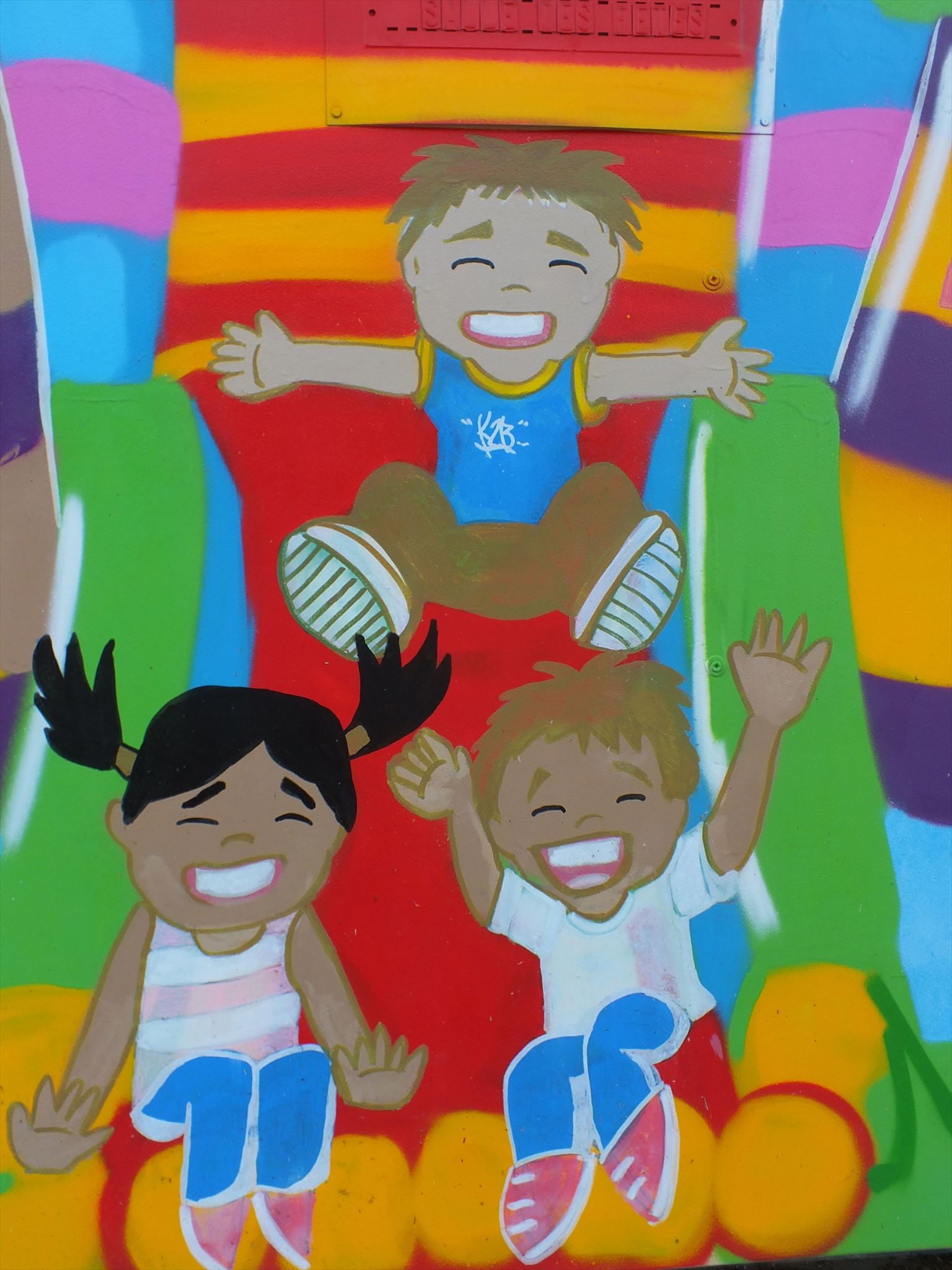 Cette fresque a été faite par K2B en 2018 dans le cadre de l'aménagement de l'aire de jeu du village. Depuis, il y a une boîte à lire qui s'est rajouté.