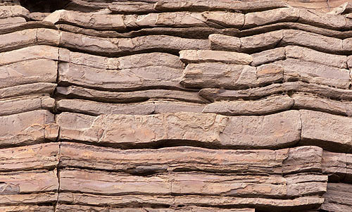 Sandstone is one of the most common types of sedimentary rock found in the world. Sedimentary rocks can be formed from particles of sand, shells, pebbles, and other fragments of material. Together, all these particles are called sediment. Gradually, the sediment accumulates in layers and over a long period of time hardens into rock. An example might be millions of years ago a flood caused a layer of sand to be deposited. This might create one layer of the rock you see here. Then maybe a few years or many years later another flood left another layer of sand. Again, another layer is created. This process continued for millions of years, the lower layers gradually getting squeezed more and more by the heavy deposits above them. The thickness of the layer is determined by the amount of sediment deposited, therefore a bigger and longer flood would deposit more sediment creating a thicker layer