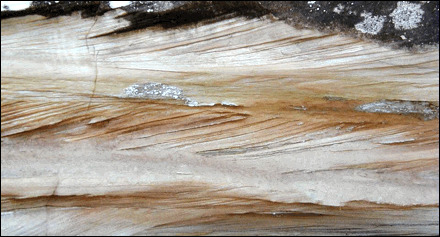 If this sandstone was deposited on a nearly flat plane, but the beds below were laid down on a sloping surface, you end up with cross bedding - it looks rather like brush strokes going one way and then another way on a canvas. The cross bedding may reflect the steep faces down which sediment tumbles during current transport. In a river, cross bedding may help to show which direction water was flowing. Cross-beds can tell geologists much about what an area was like in ancient times but it is quite a complex topic so we won't go into any more detail in this EarthCache.