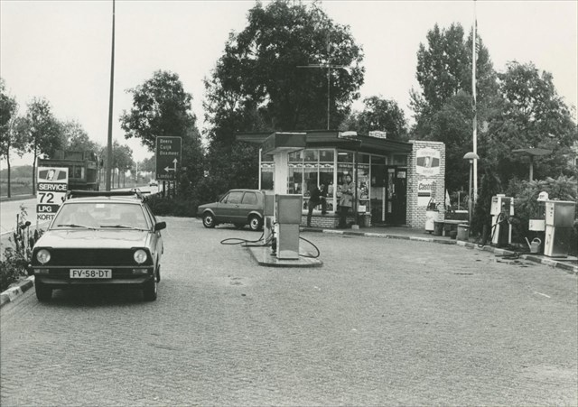 Deze foto van het tankstation is uit 1982 en is gemaakt door Jan Waarma. Op deze foto is nog de oude bedieningskiosk te zien