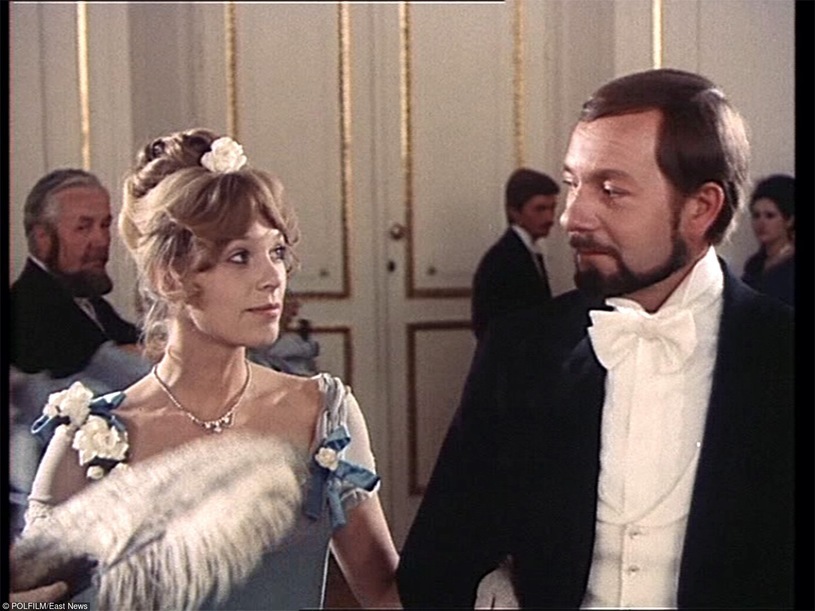 Kadr z serialu Lalka (1977), Małgorzata Braunek i Jerzy Kamas; na zdjęciu w tle widać Beatę Tyszkiewicz we wcześniejszej filmowej adaptacji Lalki z 1968