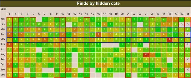In dem Kalender der "Funde nach Versteckdatum" müssen an 12 beliebigen Tagen eines Monats für alle 12 Monate ein Fund nachgewiesen werden. Außerdem ist für drei beliebige Monate ein Fund an jedem Tag nachzuweisen!