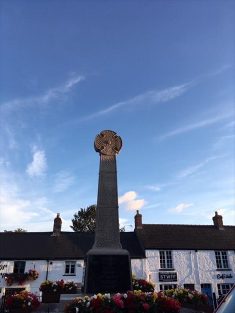 The given coordinates will take you to the War Memorial in Llantwit Major. Here you will find a cross inscribed on its south side. By using this inscription: