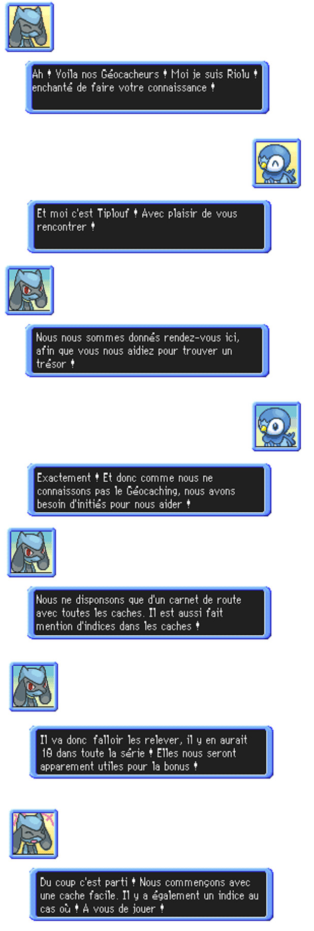 Riolu : Ah voila nos Géocacheurs ! Moi je suis Riolu ! Enchanté de faire votre connaissance !