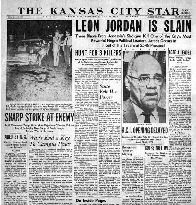 After three terms in the Missouri House of Representatives, Leon Jordan was campaigning for a fourth term. That all came to end at around 1 a.m. on July 15, 1970. Jordan was leaving his business for the night and was a few feet away from his car when a late 60’s Pontiac came up beside him and fired a shotgun blast to his leg. While laying on the sidewalk the shooter jumped out and fired two more shots. Both point blank to the chest and groin areas. As the getaway car sped up 26th and disappeared they must’ve made a quick stop at 24th and Garfield and pitched the weapon (later recovered) and ditched the car at 23rd and Highland. The murder remains unsolved but is believed it was an execution by the Nick Civella family due to Jordan’s refusal to back off from his efforts to “clean up the streets”.