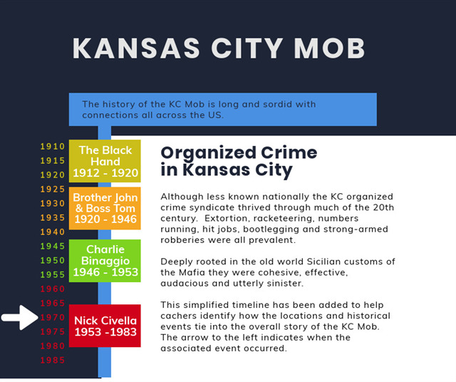 This series attempts to inform geocachers on the shockingly high number of locations around town with ties to organized crime. A lot of time went into researching this series and I’d like to give a special thanks to the wonderful folks in the Missouri Valley Room at the Kansas City library for patiently pulling old newspaper articles and microfiche for me. Additionally, large portions of the source material came from books by Terence O’Malley and William Ouseley. Bill Ouseley is a retired Special Agent with the FBI who spent over twenty years working in the organized crime squad.