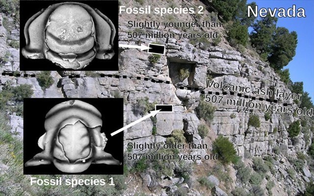 In this example, the volcanic ash layer is dated as 507 million years old (myo). The fossil species below the ash must be slightly older than 507 million years, and the species above the ash must be slightly younger. If rocks in different places contain the same fossil species, they must be similar in age. Tracing of rocks and fossils from one place to another is called correlation.