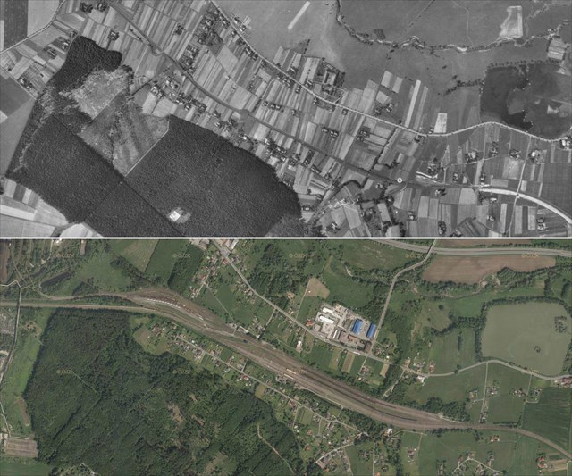 Porovnání fotomapy z roku 1949 a aktuální (zdroj: https://kontaminace.cenia.cz)