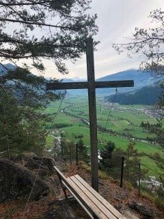 Aufgrund des steilen Aufstieges und des oftmals rutschigen Untergrundes empfehle ich NICHT denselben Rückweg, sondern den Umweg über die Fiechter Kapelle und den Kreuzweg. Dafür geht Ihr unterhalb der Felszinne des Spitzerköpfls den Wegweisern folgend Richtung Fiechter Kapelle. Hier geht Ihr noch einmal ca. 15 Minuten steil bergauf (Vorsicht viele rutschige Baumwurzeln) und Ihr erreicht einen Forstweg. Dann rechts ab, dem Weg folgend bis Ihr die maximale Höhe von ca. 950m erreicht. Ab hier geht es den Forstweg bergab bis Ihr irgendwann am Ende des Waldes am Übergang zu den Almwiesen rechts den Abzweig Fiechter Kapelle nehmt. Die Fiechterkapelle steht an einer Kreuzung zweier Wander- und Forstwege, nehmt den Pfad hinab entlang des Kreuzweges bis Ihr wieder Bruck und den Ausgangspunkt erreicht.