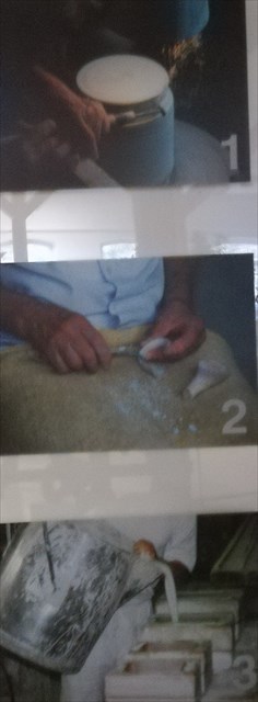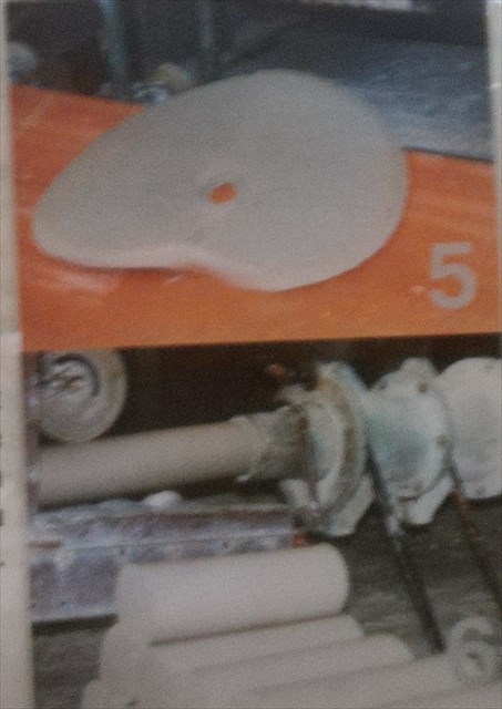 A. Gießen: Der Schlicker wird über Vorratsbehälter über Leitungen und Schläuche in die Arbeitsformen gefüllt (8). Die Gipsform saugt Wasser aus dem Schlicker und bildet so den Scherben.Nach einer Trockenzeit wird der Formling der Form entnommen und kann „Weiß“ trocknen. Alle auftretenden Nähte müssen im Anschluß am Formling verputzt werden (9).