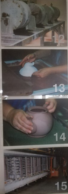 Die Rohstoffe werden zusammen mit Wasser in Trommelmühlen (12) gemahlen und anschließend werden die groben Bestandteile ausgesiebt. Bevor die geformten und „weißgetrockneten“ Porzellanteile glasiert werden können, müssen sie im Glühbrand bei ca. 980°C verfestigt werden. Das Aufbringen der Glasur erfolgt durch Tauchen in die flüssige Glasur (13). Im folgenden Glattbrand bei 1260°C verschmelzen alle Bestandteile und „sintern“ um 14% zusammen. Die Glasur schmilzt fest darauf.