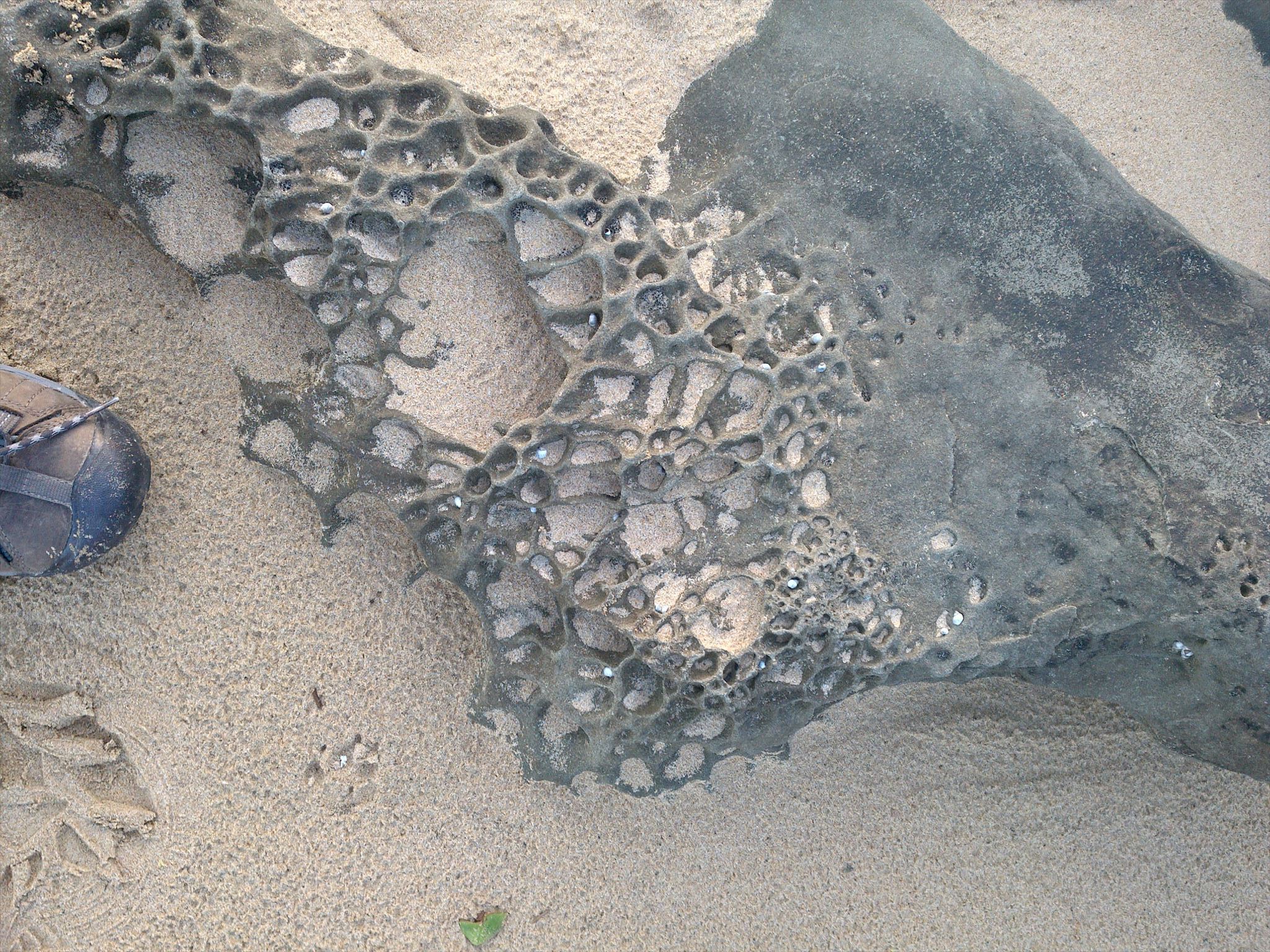 Once you had a good look at the s Spheroidal weathering come back down on to the rocks that are flat on the ground and merge with the water. Here, you can see a completely different weathering feature, which is called honeycomb weathering.