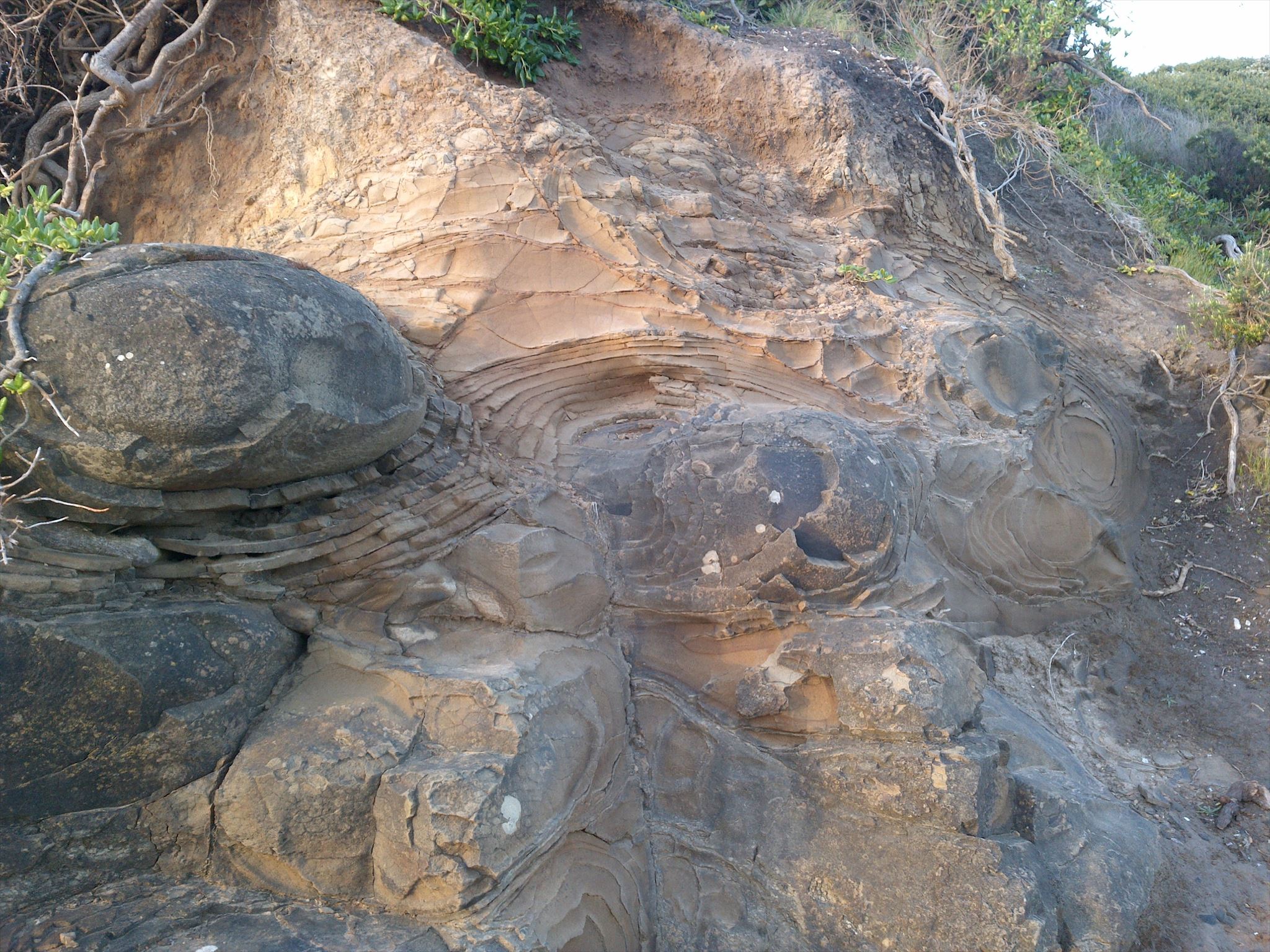 The coordinates will take you near a cliff face. If you look up on the outcropping rocks and even step a bit further up on the wall, you can see a volcanic rock (Basalt), which shows spheroidal weathering.