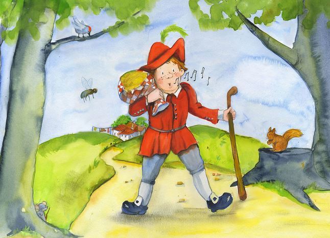 "Hans hat sieben Jahre bei seinem Herrn gedient, da sprach der zu ihm: "Herr, meine Zeit ist herum, nun wollte ich gern wieder heim zu meiner Mutter, gebt mir meinen Lohn." Der Herr antwortete: "Du bist mir treu und ehrlich gewesen: wie der Dienst war, so soll der Lohn sein", und gab ihm ein Stück Gold, das so groß als Hansens Kopf war. Hans zog sein Tüchlein aus der Tasche, wickelte den Klumpen hinein, setzt ihn auf die Schulter und machte sich auf den Weg nach Hause."