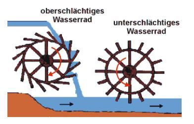 b) Welche Energie wird beim rechten, dem unterschlächtigen Wasserrad umgesetzt? Der BSW der Lösungswörter (zwei) sei B.