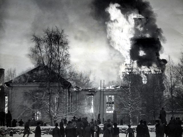 Burträsk kyrka brinner på tredjedag jul 1945 (Källa: Samlingar Skellefteå museum, hämtad 10 november 2019, https://samlingar.skellefteamuseum.se/items/show/313160.)
