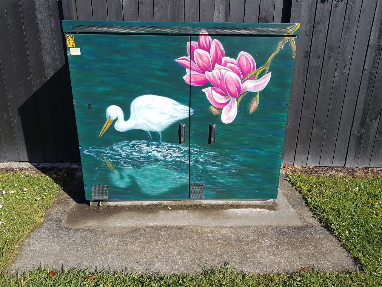 This is one of the boxes commissioned by Chorus to be painted in Marlborough and is done by Gynelle Blake whose art brightens up many Chorus boxes.