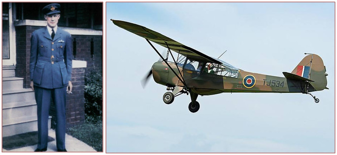 Rechts: Een vliegende Taylorcraft Auster Mk.V. Een dergelijke verkenner en verbindingstoestel