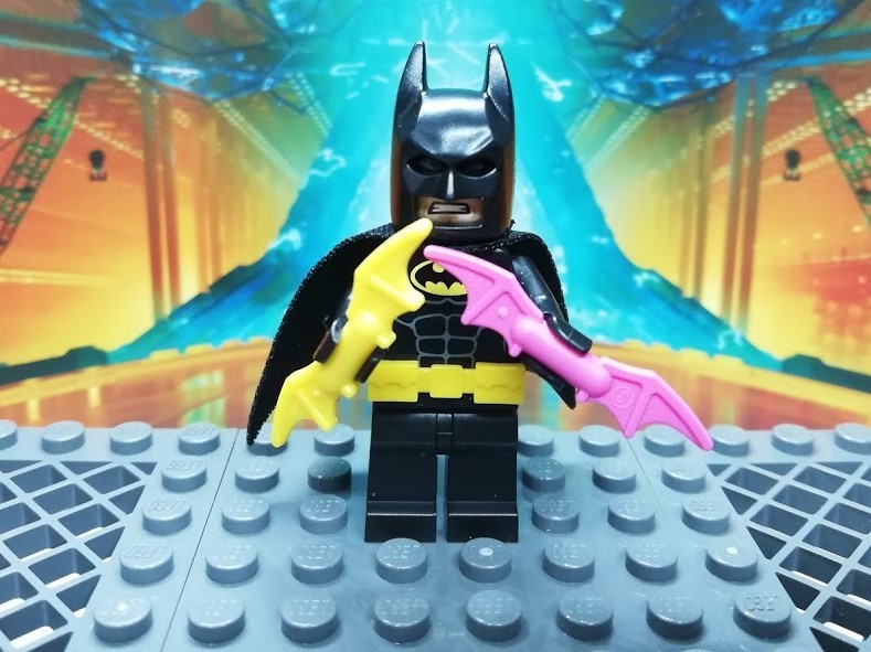 Batman er en superhelt men uden superheltekræfter, Efter mordet på begge hans forældre beslutter han sig for at træne sig selv til perfektion både fysisk og intellektuelt. Derudover er han godt hjulpet af forskelle gadgets og udstyr i hans kamp mod forbryder. Han er også kendt for at være klædt i mørt for at kunne skjule sig i natten i "The LEGO movie" er der en scene hvor han siger "I only work in black. And sometimes, very very dark grey." Derfor kan det godt undre lidt at LEGO har lavet hans kendte "Bat-A-Rang" i gul og pink (se billede)