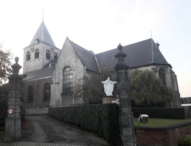 Door de lange bouwhistoriek biedt de kerk momenteel een vrij heterogeen uitzicht. De plattegrond ontvouwt een neoclassicistisch driebeukig schip van drie traveeën (1834) met een ingebouwde vierkante westtoren uit de 13de eeuw, een laatgotisch transept van een travee met rechte sluiting, een koor van drie traveeën met een driezijdige sluiting (begin 16de eeuw en latere aanpassingen) en een tegen de noordzijde van het koor aangebouwde rechthoekige sacristie, vermoedelijk uit de 15de eeuw. Het geheel is overwegend opgetrokken uit kalkzandsteen, het schip dat in de loop van de 19de eeuw herbouwd en verbreed werd in baksteen, alles onder leien bedaking. Vrij zware en verankerde westtoren door omlopende cordons verdeeld in drie, in hoogte variërende geledingen onder een ingesnoerd tentdak, licht overkragend op natuurstenen consoles. De eerste geleding met hoge afgeschuinde plint, wordt begrensd door versneden hoeksteunberen waartussen een rechthoekige deur met een spitsboogveld voorzien van een drielob, ingeschreven in een omlijsting met driekwartzuiltjes voorzien van een knoppenkapiteel. Bekronend spitsboogvenster met ijzeren roeden. De tweede geleding wordt geopend door een oculus onder druiplijst met gestrekte uiteinden en de derde geleding vertoont aan elke zijde een of twee rondbogige galmgaten. Voor de ingang liggen nog hardstenen grafplaten onder de asfaltlaag. Sober aandoend neoclassicistisch schip opgetrokken uit baksteen op een onderbouw van kalkzandsteen met kwartholle aflijning. Zichtbare muurankers en eenvoudige rondboogvensters met imposten en sluitsteen van witsteen. In de westgevels van het schip is de aanzet van de oude constructie duidelijk zichtbaar door het verschil in materiaal; aan deze zijde is er telkens een klein rechthoekige venster met hardstenen latei en lekdrempel. Eronder telkens een ingemetselde gedenkplaat verwijzend naar de werken ten tijde van pastoor Mangelschots, inmiddels nagenoeg onleesbaar geworden. De sluitingen van de ongelijke transeptarmen zijn opgevat als puntgevels op schouderstukken, gevat tussen steunberen, overhoeks aan de zuidzijde. Deze gevels worden vandaag geopend door een rondboogvenster in een kwarthol geprofileerde omlijsting maar de sporen van de vroegere spitsboogvensters onder omlopende druiplijst zijn nog duidelijk zichtbaar. In de oostgevel van de zuidelijke transeptarm bevindt zich nog een ingemetselde grafplaat van 1787. Ook het koor wordt geopend door eenvoudige, later ingebrachte rondboogvensters in een vlakke hardstenen omlijsting met uitzondering van de driezijdige sluiting waar spitsboogvensters onder omlopende druiplijst bewaard bleven en voorzien zijn van neogotisch maaswerk; ze zijn gevat tussen versneden steunberen. In de zuidzijde dichtgemetseld rondboogdeurtje met kruismotief in het boogveld (voormalig paradijspoortje?). Tegen de koorsluiting bevinden zich een Calvarie en twee grotere neogotische grafstèles uit de 19de eeuw. De ruime rechthoekige sacristie met zware, versneden hoeksteunberen telt twee bouwlagen onder een steil zadeldak op natuurstenen consoles. De sterk verhoogde begane grond is toegankelijk via een hardstenen steektrap met ijzeren leuning. Op de benedenverdieping getraliede rechthoekige vensters in een vlakke hardstenen omlijsting; op de bovenverdieping eenvoudige steekboogvensters.