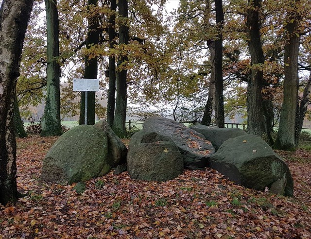 Eigentlich handelt sich um die Reste eines sechs mal zwei Meter großen Ganggrabes mit erkennbarem Zugang an der Mitte der Südseite; 9 Trag- und 4 Decksteine sind noch gut erhalten.