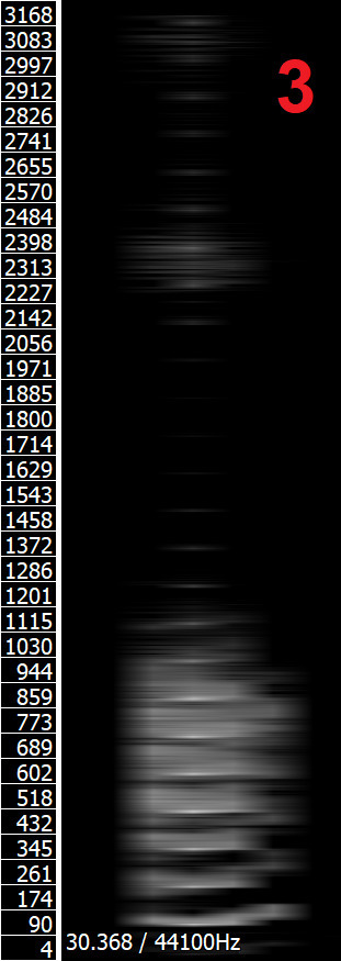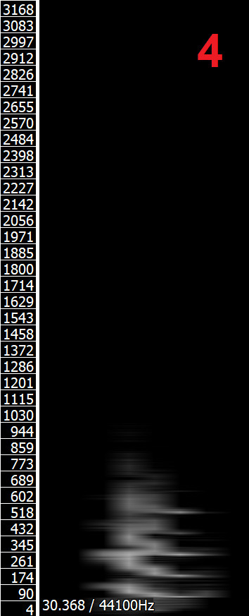 Les images ci-dessus présentent (de gauche à droite): un spectrogramme de voyelle /i/ de bonne qualité; un spectrogramme moyen, flou, de voyelle /i/; un spectrogramme de voyelle /u/ de bonne qualité; un spectrogramme moyen, flou, de voyelle /u/ (source de l'audio: Wikipédia). Les spectrogrammes moyens se rélèvent beaucoup plus faciles à analyser — les maxima de fréquence sont facilement visibles — à 250 et 2500 Hz sur le spectrogramme de la voyelle /i/ et 250 et 600 Hz sur le spectrogramme de la voyelle /u/. Les maxima de fréquence concordent (au moins à peu près) avec les fréquences de ces voyelles sur le diagramme. Les spectrogrammes de bonne qualité montrent clairement la structure harmonique de chaque formant, ce qui rend l'analyse plus difficile, surtout dans le cas des frequénces similaires, comme pour la voyelle /u/.