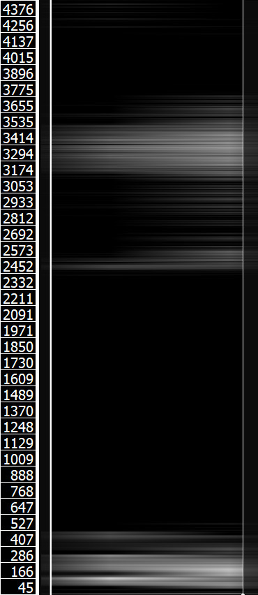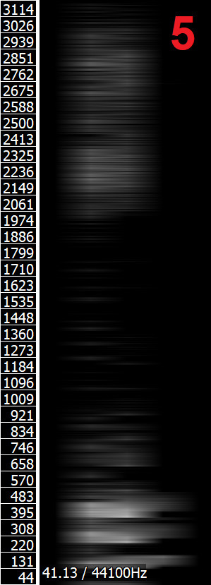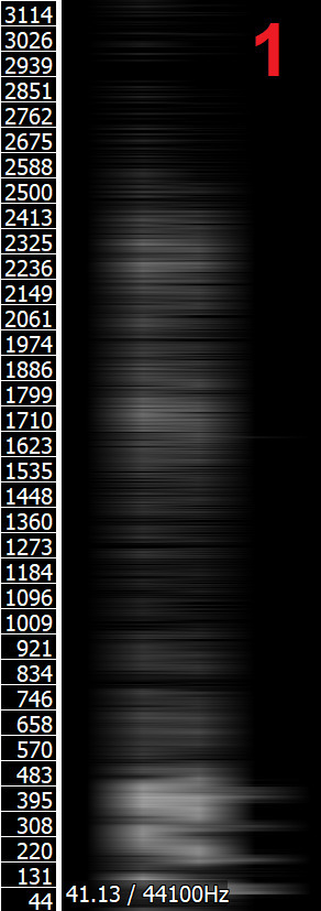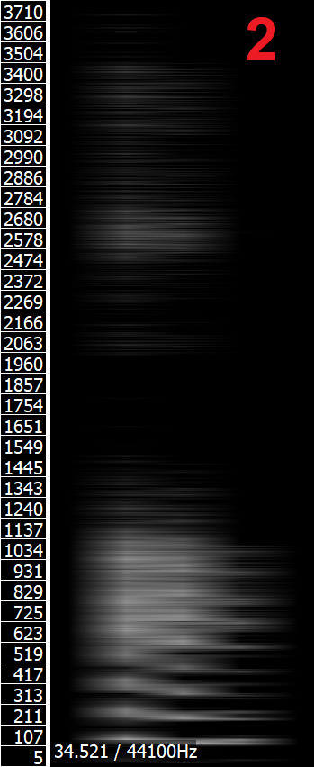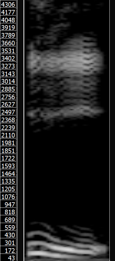 Powyższe obrazy przedstawiają kolejno od lewej do prawej: spektrogram samogłoski /i/ wysokiej jakości; uśredniony, rozmazany spetrogram samogłoski /i/; spektrogram samogłoski /u/ wysokiej jakości; uśredniony, rozmazany spetrogram samogłoski /u/ (źródło dźwięków: Wikipedia). Spektrogramy uśrednione okazują się dużo łatwiejsze do analizy — widać wyraźnie maksima częstotliwości przy 250 i 2500 Hz na spektrogramie samogłoski /i/ 250 i 600 Hz na spektrogramie samogłoski /u/. Częstotliwości te odpowiadają (przynajmniej mniej więcej) częstotliwościom tych samogłosek na wykresie. Spektrogramy wysokiej jakości wyraźnie pokazują strukturę nadtonów każdego z formantów, co znacznie utrudnia analizę, zwłaszcza w przypadku podobnej ich częstotliwości, jak w samogłosce /u/.