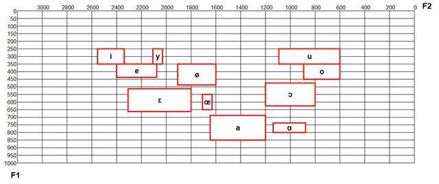 Cette question est très compliquée. Cependant, on peut beaucoup simplifier. Pour distinguer les voyelles (au moins les voyelles orales), on n'a besoin que de fréquences de deux formants plus basses, qui sont définies par (personne ne s'est attendu à cela) F1 et F2. Ces formants, ce sont simplement les bandes de fréquence qui sont amplifiées. Quand on trace les maxima de fréquences dans ces formants en articulation des voyelles particulières au diagramme, on obtient l'image comme celle ci-dessous. Celle-ci, elle montre en particulier les voyelles de la langue Française (sauf le e caduc).